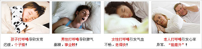 4、妇女孕妇打鼾危害: 婚前有打鼾疾病的女青年,如不及时治疗会影响婚后的性生活和怀孕后胎儿的发育,还会造成皮肤粗糙、面色灰暗、口臭口苦、体态变形、月经不调,甚至提前3-15年进入绝经更年期。孕妇打鼾可能殃及腹中胎儿,打鼾严重的孕妇血压会升高,发生低氧血症的可能性也增大,而这些病理变化将累及胎儿的发育,造成胎儿发育迟缓。