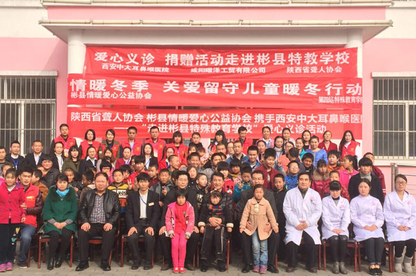 为呼吁全社会共同关注弱势群体,11月18日上午陕西省聋人协会、彬县情暖爱心公益协会携手西安新城中大耳鼻喉医院在彬县特殊教育学校为该校学生开展“关爱残疾儿童·关注弱势群体”爱心义诊,帮助孩子们检查身体。